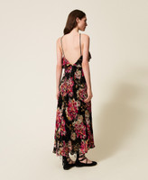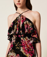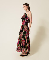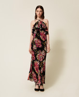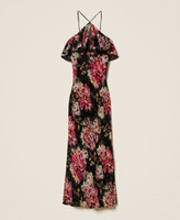 Abito lungo in velluto panné misto seta made in Italy con disegno cashmere lavorato in dévoré e stampa florale pittorica, esclusiva Twinset. Ha scollo halter con laccetti da annodare dietro al collo, apertura a goccia davanti, doppia balza arricciata, chiusura con zip sul retro, fodera in georgette, linea fitted.