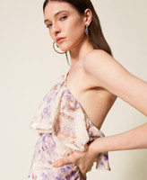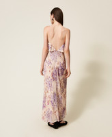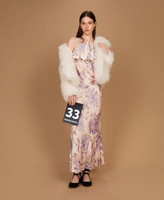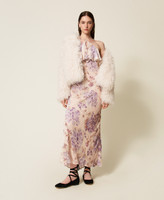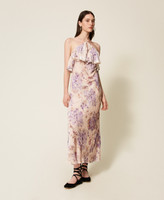 Abito lungo in velluto panné misto seta made in Italy con disegno cashmere lavorato in dévoré e stampa florale pittorica, esclusiva Twinset. Ha scollo halter con laccetti da annodare dietro al collo, apertura a goccia davanti, doppia balza arricciata, chiusura con zip sul retro, fodera in georgette, linea fitted.