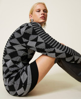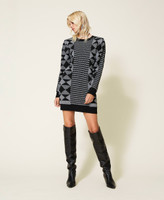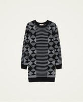 Abito corto jacquard lurex con disegni geometrici, collo tondo, spalle scese con arricciatura, profili a costine.