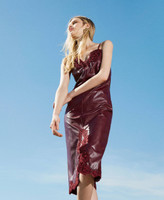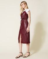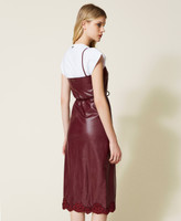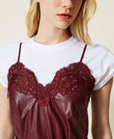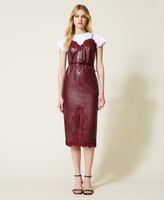 Abito longuette effetto pelle con profili rifiniti da bordi in pizzo macramè rebrodé abbinato a T-shirt in cotone.