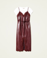 Abito longuette effetto pelle con profili rifiniti da bordi in pizzo macramè rebrodé abbinato a T-shirt in cotone.