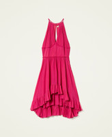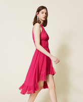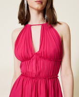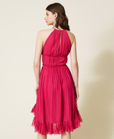 Abito longuette in georgette leggera plissé con tagli profilati da micro volant in tessuto, collo con coulisse, balza al fondo.
