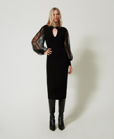 Abito longuette in maglia di misto viscosa stretch con apertura a goccia davanti. Ha maniche ampie in pizzo con polsi in maglia, chiusura con fibbia Oval T in metallo sul retro, linea fitted.