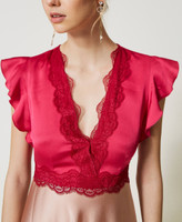 Abito longuette in raso martellato bicolore con dettagli rifiniti da pizzo Valenciennes smerlato, scollo a V incrociato, maniche ad aletta con arricciatura e zip al fianco. Questo articolo fa parte della selezione 'Archive', ispirata dai capi più iconici e amati delle collezioni Twinset.