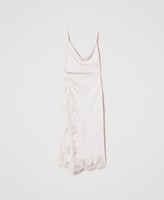 Abito longuette modello slip dress, in raso con costruzione effetto portafoglio che crea uno spacco. Ha gli spallini sottoli, lo scollo dritto, arricciatura di lato e dettagli in pizzo al fondo e sullo spacco. Zip al fianco con gancio, linea fitted.