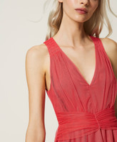 Abito longuette in tulle con gonna a balze arricciate in dégradé, drappeggio al punto vita, scollo a V profondo, foderato.