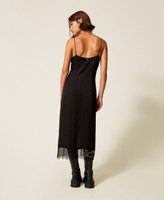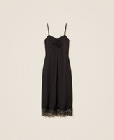 Abito sottoveste longuette firmato dall’artista Myfo per la collezione Actitude in raso di viscosa con pizzi applicati su scollo e fondo e ricamo a contrasto. Presenta cucitura arricciata davanti, spalline sottili, spacco centrale e linea dritta.