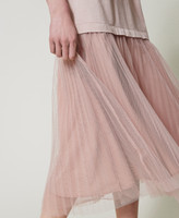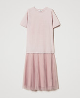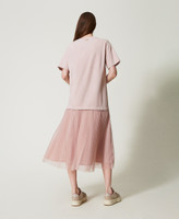 Abito lungo trompe l’oeil effetto doppio capo in jersey di cotone stretch con parte inferiore in tulle plissé. Ha collo tondo, maniche corte, fodera in crêpe de Chine, logo in metallo sul retro, linea morbida.