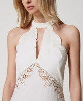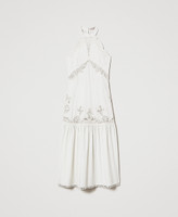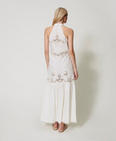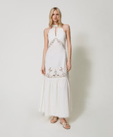 Abito lungo in cotone con ricami piazzati intarsiati in filo. Ha scollo halter e giromanica smerlati rifiniti da ricamo, balza arricciata, fondo rifinito da passamaneria, chiusura con zip al fianco, placchetta logo Oval T sul retro, linea leggermente svasata.