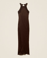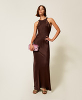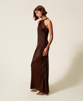 Abito lungo in raso di viscosa con ricamo a filo intarsiato su base tulle che rifinisce scollo e giromanica. Ha scollo all'americana e scollatura profonda a V sul retro, chiusura con zip, placchetta logo Oval T sul retro, linea fitted.