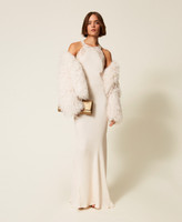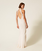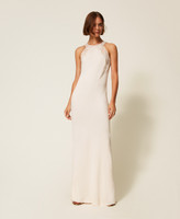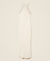 Abito lungo in raso di viscosa con ricamo a filo intarsiato su base tulle che rifinisce scollo e giromanica. Ha scollo all'americana e scollatura profonda a V sul retro, chiusura con zip, placchetta logo Oval T sul retro, linea fitted.