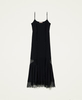 Cattura l'attenzione con l'abito lungo a spalline sottili in chiffon leggero. È arricchito da un pannello intarsiato a plissé bastonetto con profili rifiniti da pizzo Valenciennes smerlato. La gonna morbida è arricciata e arricchita al fondo con balza in pizzo smerlato. È foderato in crêpe de Chine. Da abbinare a maxi pull o cardigan, per un'eleganza décontracté.
