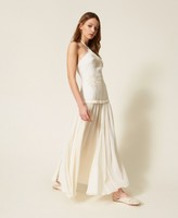 Abito lungo in misto lino e doppio strato di georgette. La parte superiore ha ricamo esclusivo Twinset di foglie Cornely con filo di spessori diversi, profili rifiniti da ricamo à jour, scollatura halter con lacci in tessuto, schiena scoperta, chiusura con zip sul retro. La gonna è ampia con spicchi inseriti che aumentano il volume al fondo, logo a cuore in metallo, linea fit & flare.
