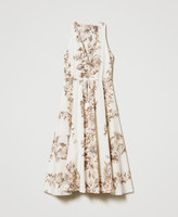 Raffinato e versatile l'abito lungo in tessuto italiano popeline di cotone con stampa esclusiva per Twinset. La grafica di fiori e foglie monotono su fondo colorato ha un piazzamento verticale. Linea morbida, scollo a V, gonna svasata, zip al fianco, placchetta logo Oval T sul retro. Sarà l'abito perfetto da indossare day-to-night.