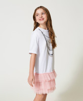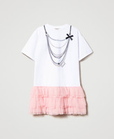 Abito corto over in jersey di cotone stretch con stampa ad acqua e gonna a balze in tulle plissé, maniche corte con risvolto.