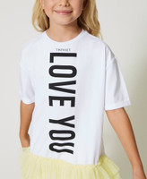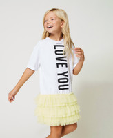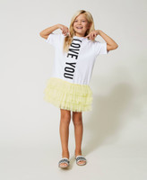 Ha un'aria sbarazzina l'abito corto over da bambina in jersey di cotone stretch con stampa ad acqua e logo. Girocollo, maniche corte con risvolto cucito, gonna a balze di tulle plissé. Aggiungi sneakers o sandali e il look è completo.