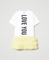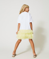 Abito corto over in jersey di cotone stretch con stampa ad acqua e gonna a balze in tulle plissé, maniche corte con risvolto.