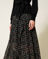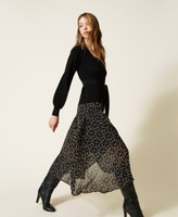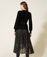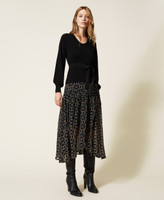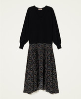 Effetto trompe l’oeil per l’abito lungo made in Italy in maglia seamless di viscosa stretch con collo ampio tondo, maniche lunghe con polsino a coste e inserto in georgette a gonna con stampa logo Oval T floreale all over, disegno esclusivo Twinset. L’inserto a gonna è arricciato e foderato in crêpe de Chine. Da completare con stivaletti o tacchi alti a seconda dell’occasione.