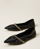 Ballerine morbide, dalla punta sfilata, con apertura arricciata, catena dorata e targhetta logo pendente.