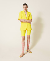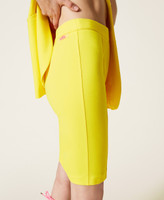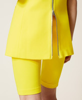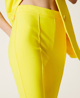 Per look stand out. Bermuda fitted in punto Milano con lunghezza al ginocchio, zip e bottone, pinces davanti, tasche ai fianchi e piega stirata.