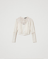 Blusa cropped in mussola di cotone con inserti in pizzo a disegno floreale e ricami a filo con traforo fatti a mano. Ha collo tondo, apertura sul retro con bottoni a vista, maniche lunghe arricciate ai giri, lavorazione a piccole pieghe confezionate artigianalmente, linea fitted.