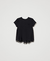 Blusa collezione Actitude in popeline con balza in sangallo sul retro con arricciatura fondo rifinito in pizzo in tono, collo tondo.