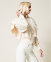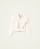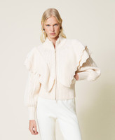 Bomber in misto lana con mix di punti e trecce, collo a lupetto a coste, balza in maglia smerlata, zip.