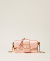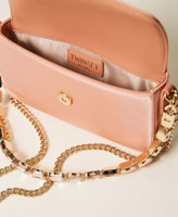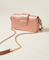 Borsa a tracolla 'Amie' in raso liscio con manico a spalla rimovibile in catena decorata da cabochon in tinta. Ha la chiusura con patta e magnete, tracolla rimovibile in catena con spallaccio da indossare cross-body, galvanica color oro, logo Oval T in metallo, foderata. Perfetta per party e cerimonie.