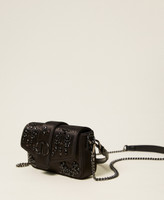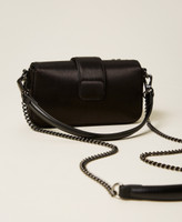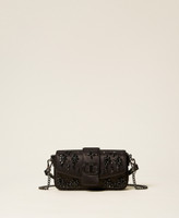 Borsa a tracolla ‘Amie’ in raso con ricamo di strass a disegno floreale e rifiniture effetto pelle di vitello liscio. Ha chiusura con patta e magnete e logo Oval T in galvanica canna di fucile. Doppia vestibilità con manico a mano o a spalla e tracolla in catena cross-body con spallaccio effetto pelle, entrambi rimovibili.