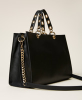 Borsa shopper 'Naira' effetto pelle con doppio manico decorato da occhielli, tracolla rimovibile con catena, tasca esterna. Twinset porta il suo messaggio di gentilezza e accoglienza in tutte le lingue del mondo: 'Naira' significa 'guerriera' e 'donna dagli occhi grandi' in lingua Aymara.