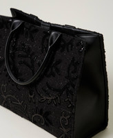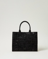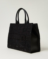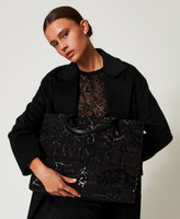 Borsa shopper 'Victoria' in tessuto con applicazioni a rilievo e ricami di paillettes. Ha chiusura con magnete, fianchi e doppio manico effetto pelle di vitello, per una portata a mano o a spalla, logo lettering sul quadrante frontale, foderata.