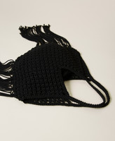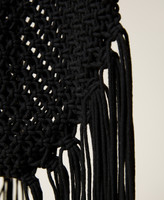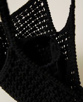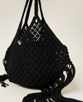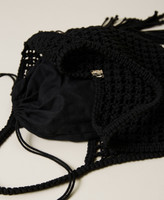 Borsa shopper a spalla in corda intrecciata a crochet, con manici, frange ai lati, sacchetto interno in tessuto.