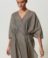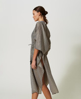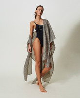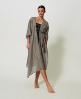 Caftano in misto modal con stampa logo Oval T all over con lurex, maniche a tre quarti, chiusura con cintura in coordinato.