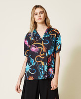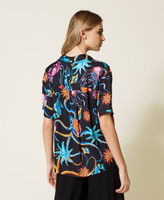 Camicia boxy in raso di viscosa con stampa, colletto, maniche corte, chiusura con bottoni.