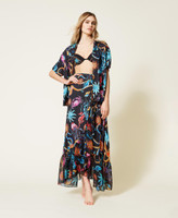 La camicia boxy a maniche corte si distingue per il suo flair: realizzata in tessuto italiano di raso di viscosa, sfoggia una stampa disegnata in esclusiva per Twinset, colletto con apertura a V, chiusura con bottoni, carré e piega a cannoncino sul retro. Si abbinerà alla perfezione con pantaloni a palazzo e sandali platform.