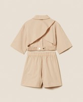 Completo da bambina in popeline di cotone stretch. La camicia cropped ha chiusura con bottoni a pressione logati, maniche a tre quarti, incrocio sul retro con motivo di cintura con elastico, linea dritta. I bermuda hanno pieghe davanti, chiusura con zip invisibile al fianco, tasche alla francese, linea ampia.