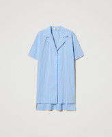 Camicia da notte in misto cotone tinto filo a righe con revers, chiusura con bottoni effetto madreperla, maniche corte, spacchi laterali, fondo asimmetrico più lungo sul retro, logo in metallo sul retro, linea dritta.