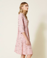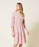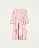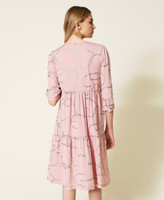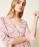 Una lucente stampa glitter di cuori che si rincorrono caratterizza la camicia da notte longuette in jersey stampato dalla linea morbida, con scollatura a V profilata in lurex, bottoni in metallo con logo, maniche a tre quarti, taglio sotto il seno, balza al fondo.