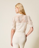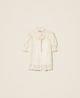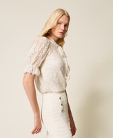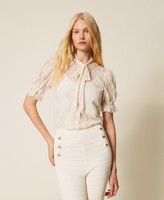 Camicia in pizzo con nastro al collo da annodare a fiocco. Ha maniche corte con arricciatura ai giri ed elastico al fondo effetto balloon, chiusura con bottoni, top rimovibile abbinato, linea dritta.