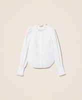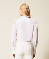 Camicia in popeline di cotone con volant in pizzo che rifinisce collo e polsi. Ha collo alla coreana, chiusura con bottoni, maniche lunghe con arricciatura ai giri e pieghe ai polsi, fondo arrotondato, linea dritta.