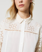 Camicia in popeline di cotone con ricami sangallo e pizzo macramè, maniche corte, chiusura con bottoni, fit regular.