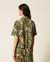 Camicia in popeline di puro cotone con stampa jungle e applicazione di castoni cuciti che decorano il colletto. Ha collo bowling con bottoni, maniche corte a giro e bottoni al fondo, chiusura con bottoni effetto corno, tasca a toppa sul petto, taglio carré e contropiega sul retro, logo a cuore in metallo, linea dritta.