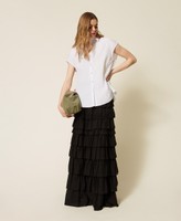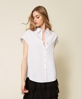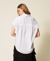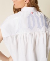 Camicia firmata dall’artista Myfo per la collezione Actitude in tessuto Oxford di misto cotone con ricamo scritta in filo tono su tono. Ha chiusura con bottoni davanti e filo a contrasto, maniche corte a kimono, pannello montato arricciato sul retro che dona volume, linea ampia.