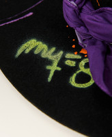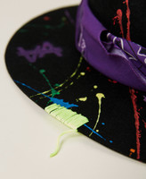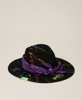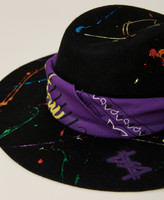 L'artista MYFO firma il cappello a tesa larga in feltro con schizzi di colore e ricami fatti a mano che rendono ogni capo unico. Ha spilla e bandana rimovibili. Firma Myfo e monogramma Actitude a dollaro stampati.
