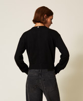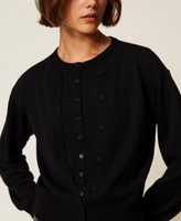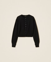 Cardigan collezione Actitude in maglia rasata con effetto doppio capo davanti. Ha collo alla coreana, placchetta logo sul retro e linea dritta.