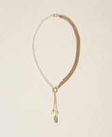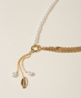 Collana girocollo in doppio materiale, costituita da catenine e perle. Ha due pendenti con perle e una medaglietta con logo lettering fermati da un moschettone con molla.