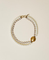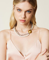 Collana girocollo con perle, strass e bottone décor in metallo martellato, chiusura con gancio.