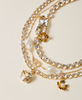Collana girocollo con catena di strass, pendenti floreali, perle, Oval T e castoni, chiusura con moschettoni.