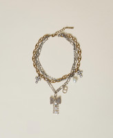 Rendi preziose le tue mise con la collana girocollo multifilo con due diverse catene, pendenti a rosario con strass, perle, fiocco con castoni, chiusura con moschettone sul retro. Donerà un tocco inedito anche ai look più basici.