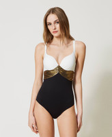 Per un glowing look punta sul costume intero con inserto laminato color bronzo. Ha coppe a cuore push-up increspate, dall'imbottitura non estraibile, ferretto, spalline larghe regolabili, scollatura arrotondata sul retro. Perfetto per sfoggiare un beach look glamour.